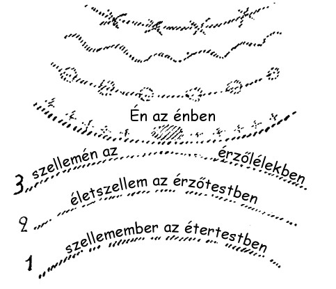 Rajzoljuk fel most az ember többi részét, most először eltekintünk a léleknek az érzőtestre, az értelmi lélekre és a tudati lélekre való tagolásától. Itt ábrázoljuk sematikusan az asztráltestet, az étertestet és a fizikai testet.