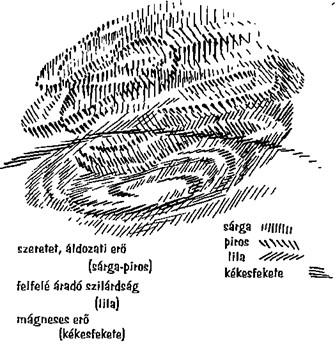 Ezáltal nyerik a rovarok azt az erőt, amiről beszéltünk, ami a kozmoszig ható ragyogásban mutatkozik. Így kapják a rovarok az erőt, amivel a velük egyesült anyagot egészen át tudják szellemíteni, s az átszellemített anyagot ki is sugározhatják a kozmoszba. Ahogyan a hő készteti a lángot fényárasztásra, úgy történik ez a Föld felületén is, mikor a rovarok a fizikai megtestesülésre leszálló embereket vonzó ragyogást a világmindenségbe kibocsátják. A rovarok azok, igen, őket lobbantja kozmoszig ható tettre a körülöttük sürgő tűzszellemek világa (l. a rajzon a piros és sárga jeleket).