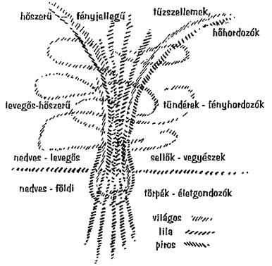 Látják kérem, ez a növény növekedésének szellemi folyamata. És mivel az ember tudattalanja sejti, hogy a sarjadó, virágzó növény körül valami különlegesség van, ezért a növényvilág titokzatosnak tűnik. A titok nem törik meg, nem törlődik le a csodálatos misztériumok hímpora; ezzel szemben azt mondhatnám, hogy a növények embert gyönyörködtető, felemelő hatása csak fokozódó elragadtatásra késztet, ha nem csak a fizikai növény van előttünk, hanem az intelligenciából alakult, közvetlenül értő gnóm-világ is, amint a növényeket fölfelé taszítja. Amint, bizonyos fokig az emberi értelem sincs alávetve a nehézkedési erőnek, hiszen úgy hordozzuk fejünket, hogy súlyát nem is érezzük, úgy győzik le a gnómok fény-intelligenciájukkal a földszerűt, s így taszítják fölfelé a növényeket. Ok terjesztik ott lenn az életet. De elhalna ez az élet, ha fel nem lobbanna a kemizmus; a fénynek pedig át kell áramolnia mindezeken. Így látjuk, mondhatnám alulról fölfelé haladva feketén-kéken a nehézkedési erőt (rajzolva), mely a törpék által vesz lendületet felfelé, és a sellők, az undinék nyüzsgését a növény körül. A levelek jelzik, amint keverik és szétválasztják az anyagokat a felnövekvő hajtásban. Fentről lefelé viszont a szilf-szellemek, a tündérek sulykolják a fényt a növényekbe plasztikus formát adva nekik, s ez a forma idealizáltan halad lefelé, ahol a föld anyai öle veszi fel. És a tűzszellemek ugyancsak körülzsongják a növényt, a magvak pontocskáiba koncentrálva a kozmikus hőt; ez is lekerül a gnómokhoz, Így alakíthatnak ők tűzből és életből új növényt.